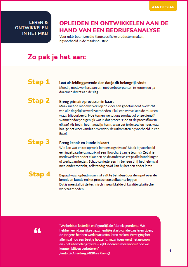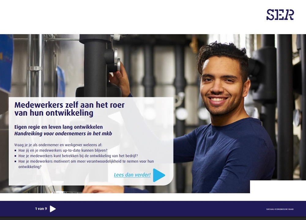 Deze gestructureerde aanpak geeft je de tools om direct stappen te zetten en je bedrijf te versterken. In de handreiking voor ondernemers in het mkb van de SER, Medewerkers zelf aan het roer van hun ontwikkeling, vind je op pagina 14-18 een vragenlijst. Deze kan je gebruiken om te bepalen hoe jullie scoren op het gebied van leren en ontwikkelen en eigen regie.