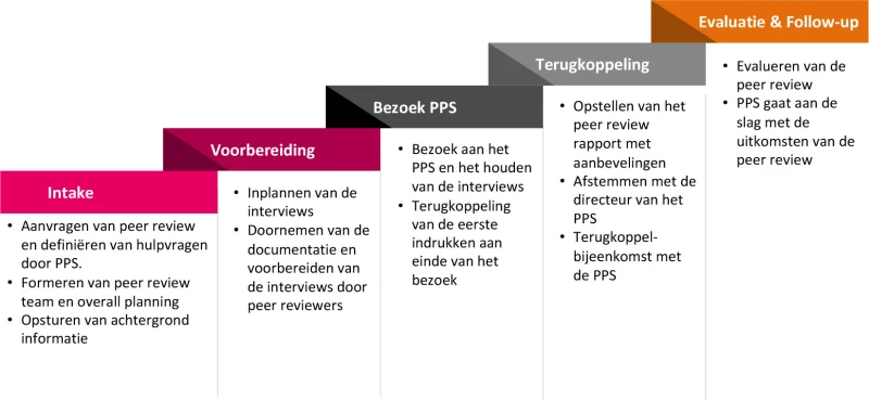 De pps vraagt een peer review aan en stelt de hulpvragen op. Er wordt een peer review team gevormd en een planning vastgelegd. De pps voorziet het peer review team van achtergrondinformatie.